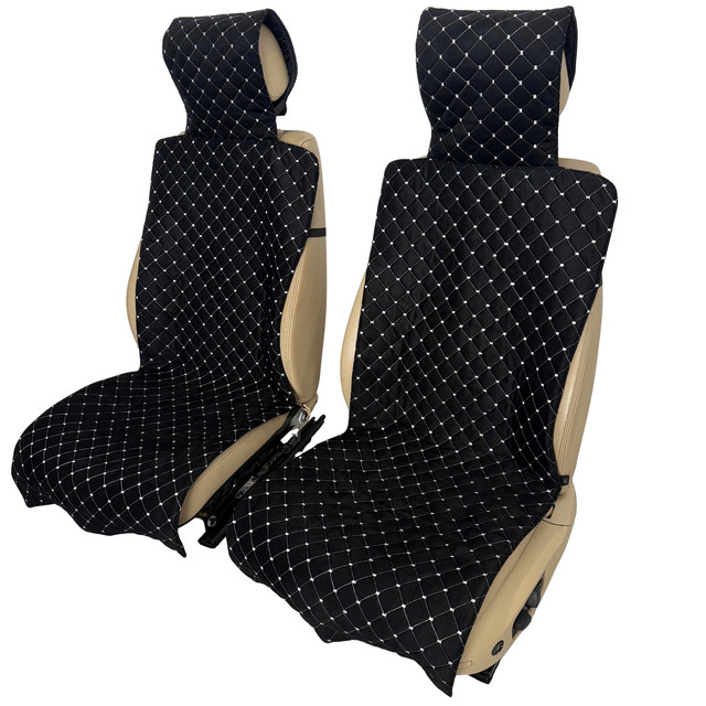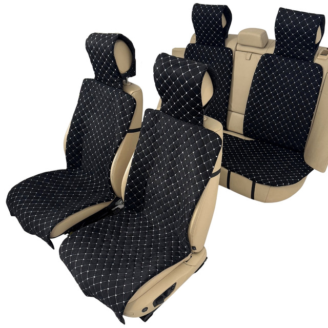 Комплектація: одна додаткова накидка. Кріплення: надійна фіксація за рахунок резинок, які фіксують накидку до підголівника та спинки сидіння. Матеріал: зносостійка еко-замша. Колір: Чорний. Декор: прошивка “ромбиками” білими нитками додає вишуканого та преміального вигляду. Розмір: Ширина спинки - 50 см. Довжина спинки - 75 см. Підголівник - 30х30 см.